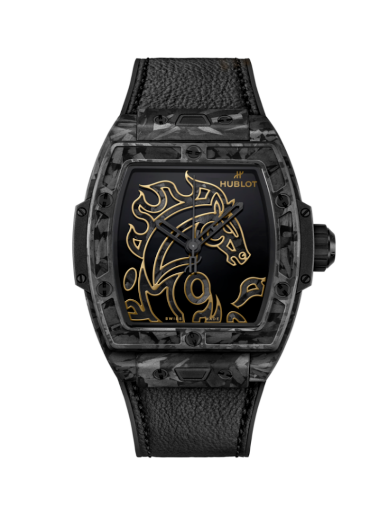Big Bang灵魂丙午马年腕表搭载HUB1710:一款可靠的高性能自动上链机械机芯。该机芯可提供约50小时动力储存,其坚固设计确保走时持续精准、运行自主稳定。这款新作亦巧妙融合碳纤维的细工镶嵌工艺、金质细节装饰及漆面润饰工艺。自2016年起,宇舶表便开始以时计创作庆贺中国农历新年,深刻诠释品牌融汇传统与现代的制表理念。全新丙午马年腕表亦承袭这一传统,以精研性能、引领风范的匠心之作,将骏马奔腾不息、勇往直前的精神,自表盘延伸至表盒,气韵贯通。