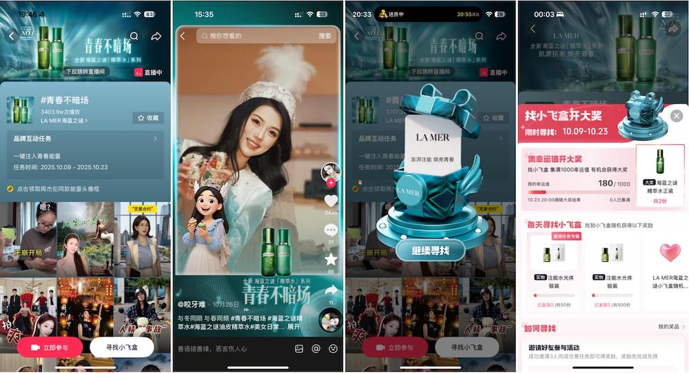 最后,海蓝之谜并未止步于心智触达,而是通过设计精巧的互动任务体系,将用户的瞬时参与热情沉淀为可持续运营的品牌关系与数据资产。在「今天也好好运动了」IP的帮助下,品牌同步推出专属AIGC运动能量贴纸。通过AIGC贴纸挑战赛、小飞盒等低门槛、高创意的玩法,激发用户记录并分享自己的“高能量时刻”,话题#青春不暗场 总曝光 1.5亿+、#海蓝之谜精萃水总曝光 4.6亿+、成功引导了大规模UGC内容的涌现,当用户使用品牌贴纸创作视频、参与话题挑战时,每一次互动都是对品牌主张的一次主动诠释与传播。这些行为不仅生产了海量的原生内容、扩大了社交声量,更在互动过程中,将用户转化为品牌理念的认同者与共建者。