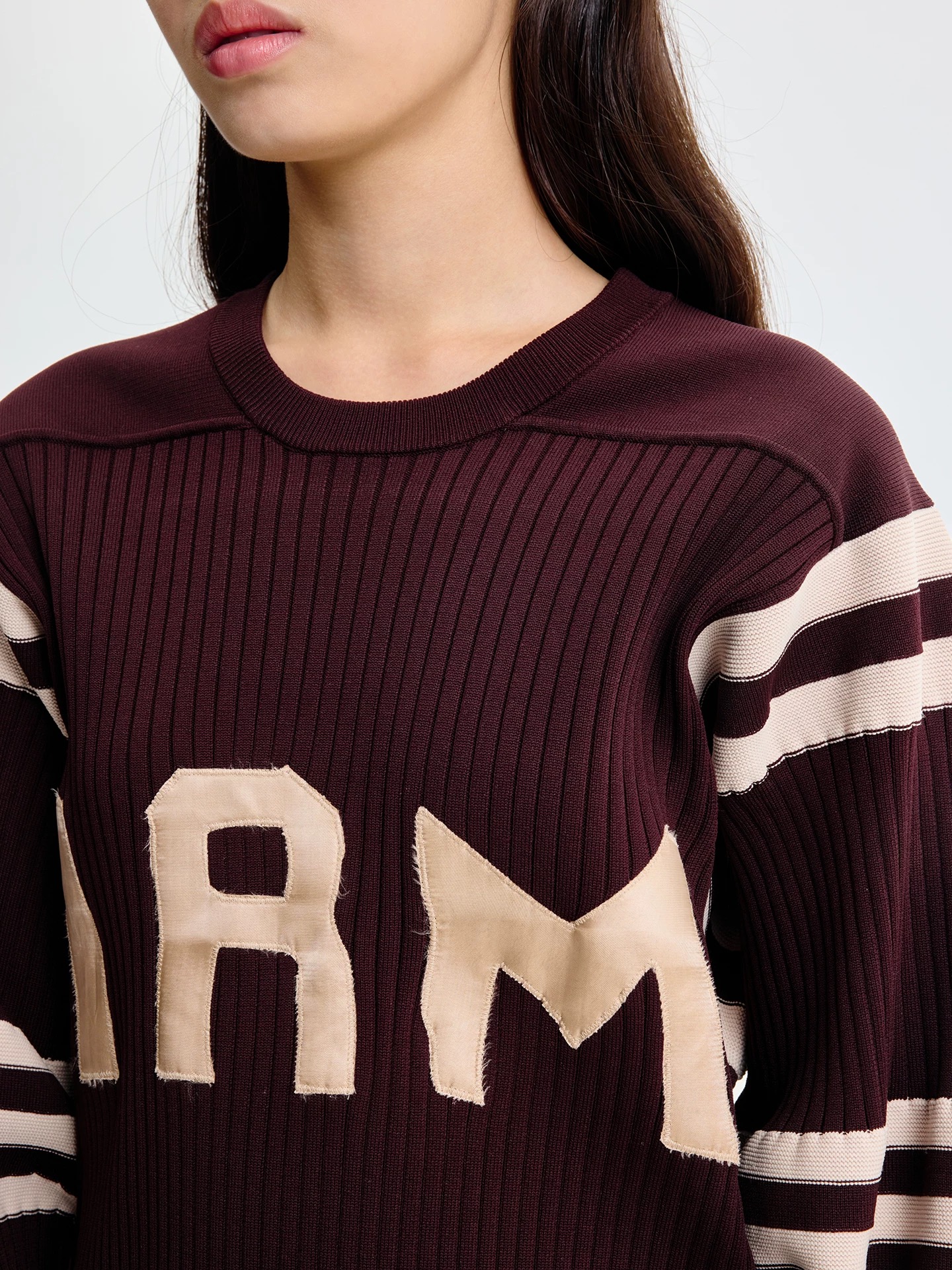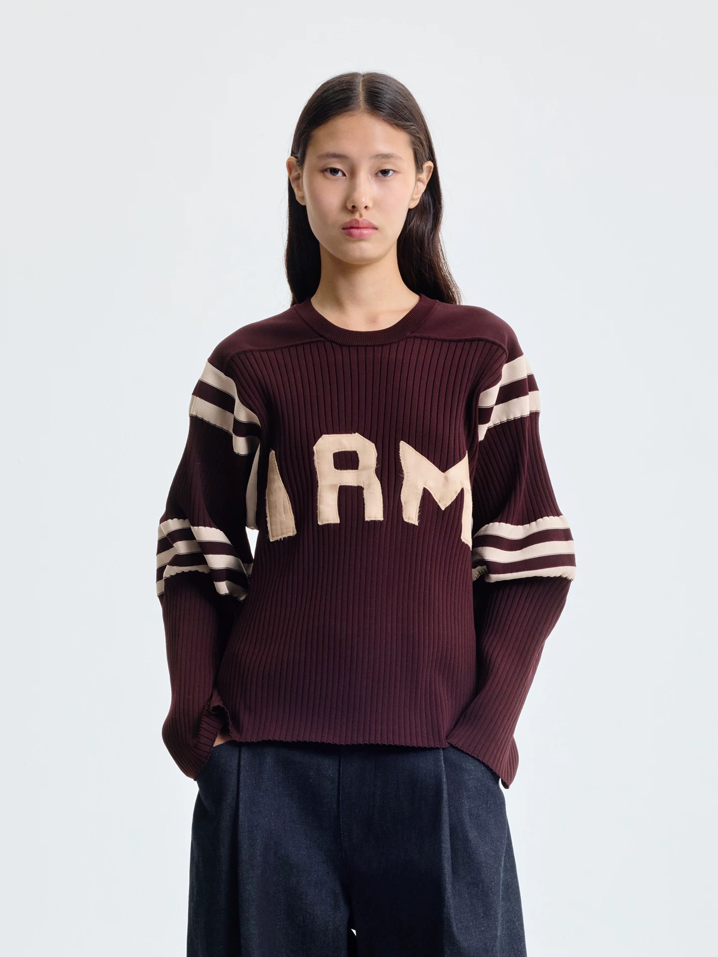 该款毛衣溯源复古球衣灵感,以针织手法重构经典。平纹与螺纹交织出立体空间感,手工贴布 “IAM” 标语搭配毛边车缝,下摆双侧开叉兼顾轻盈与包容,适配多元身形。I AM,是身份,亦是宣言,让衣着成为自我内在的从容回响。