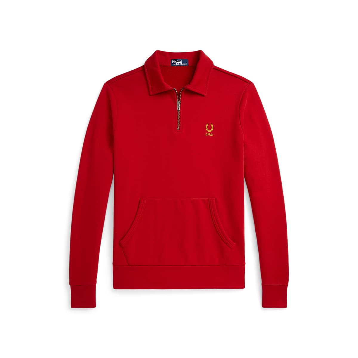 新年系列的圆领针织衫,饰有标志性 Polo 小熊图案,小熊身穿富有节日气息的 Ralph Lauren 服饰以庆贺马年,备受喜爱的吉祥物身穿无尾礼服,搭配红色袜子和精饰便鞋,站立于骏马旁边。