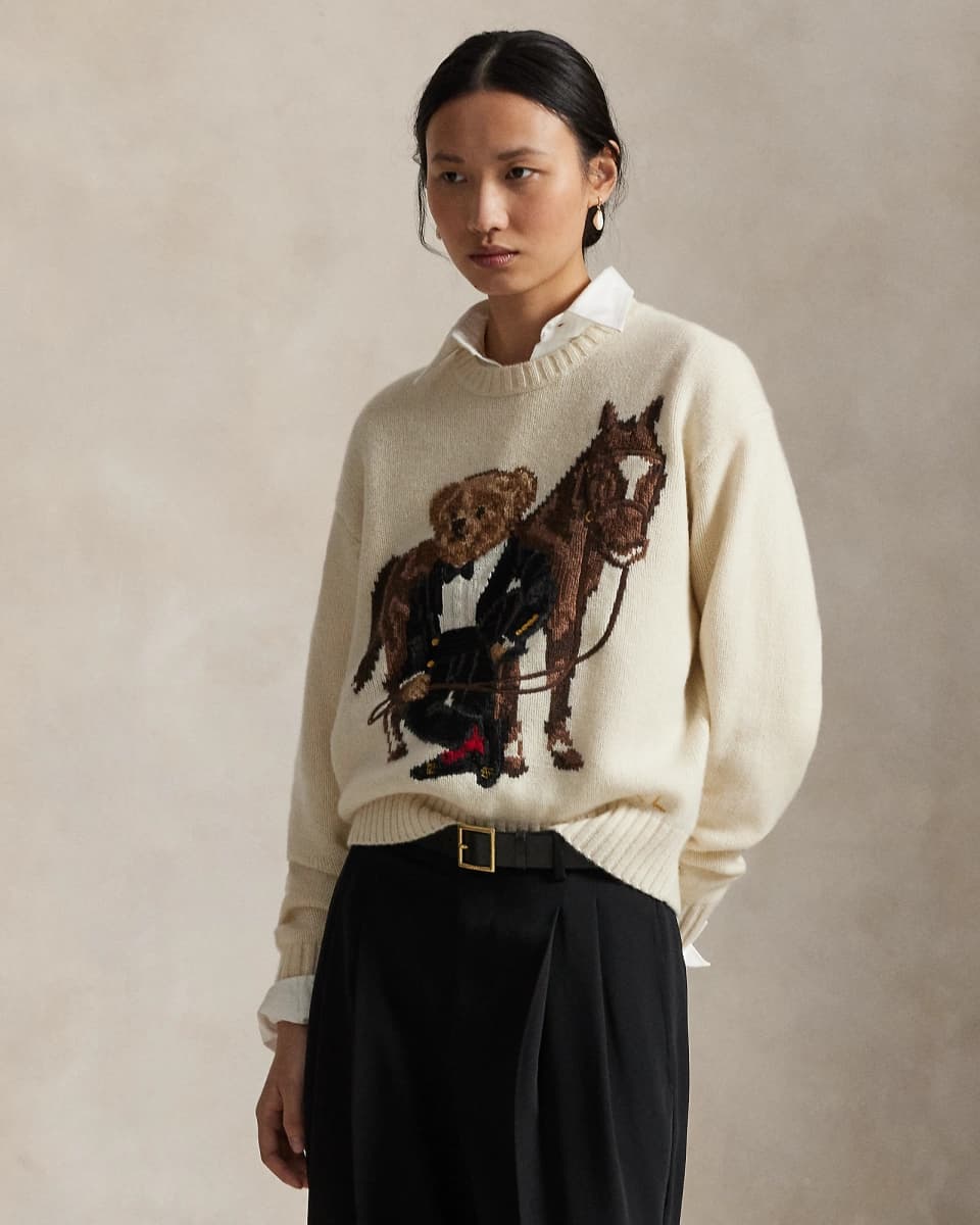 新年系列的针织衫,饰有以 20 种不同纱线打造的标志性 Polo 小熊图案,小熊身穿富有节日气息的 Ralph Lauren 服饰以庆贺马年,备受喜爱的吉祥物身穿无尾礼服,搭配红色袜子和精饰便鞋,站立于骏马旁边。