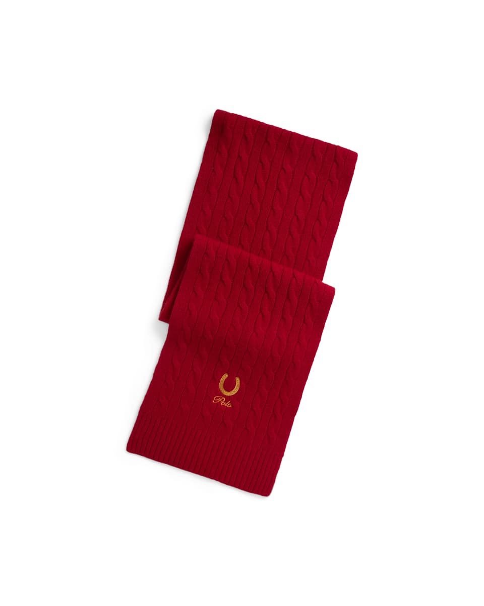 围巾饰有精美的马蹄铁图案和徽标刺绣,旨在庆贺 2026 年马年新年,选用柔软的毛纱线织就,采用经典绞花编结设计。