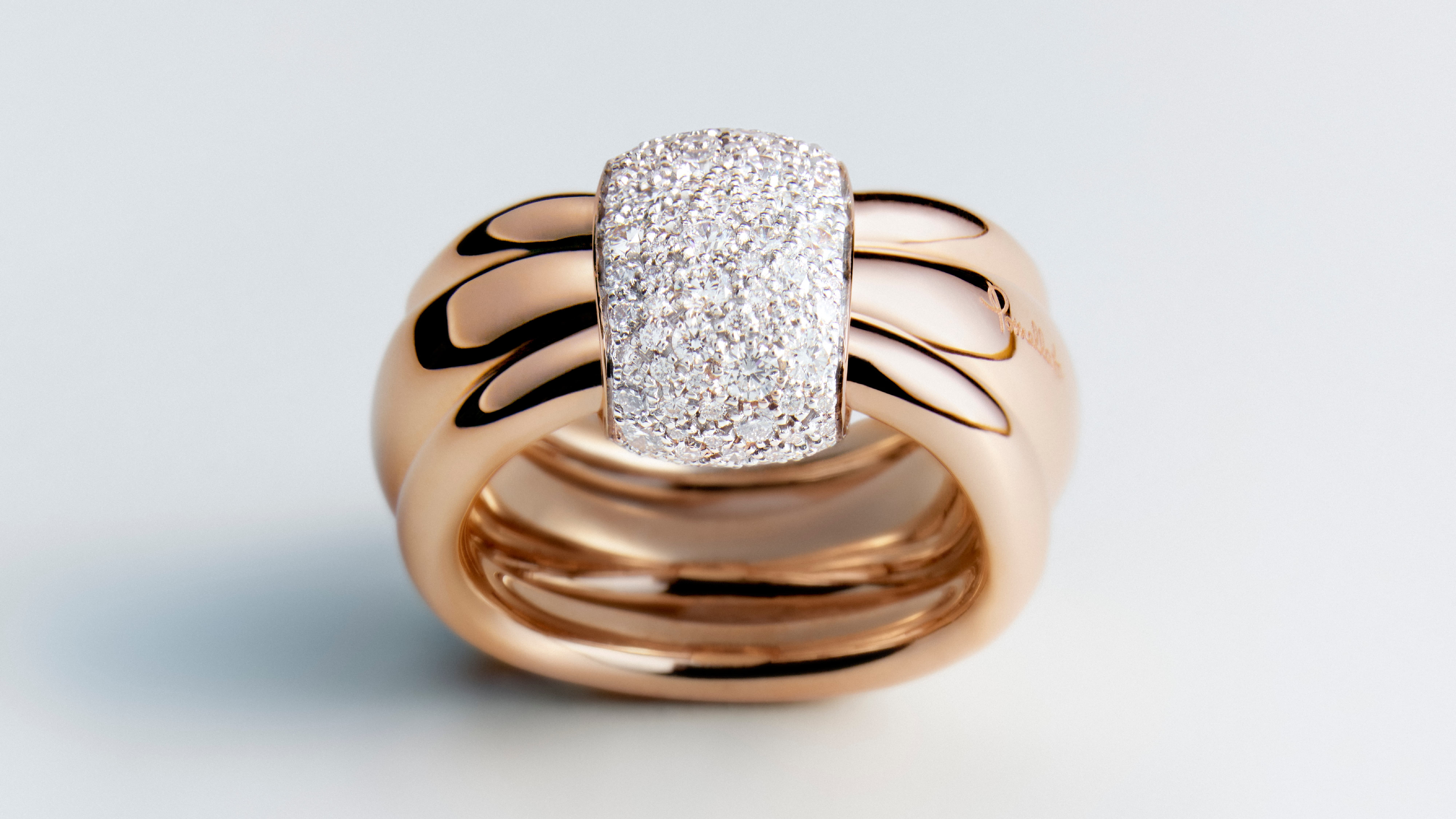 新款Pomellato Together 戒指兼具雕塑美感与柔润质感,抛光玫瑰金带缠绕交织,环绕着镶嵌不规则密镶白钻的链节。此时,钻石无需工艺定义,而以情感言说——璀璨光彩点亮真挚心意,加深情感连结。戒指的结构灵动独特:三枚独立的金环围绕中央链结而成,既具丰盈体量又保持精致柔和,其工学设计贴合佩戴舒适度,并经过手工打磨以呈现温润触感。无论作为现代誓约、私人纪念,或一份真挚心意的礼物,它都以当代优雅诠释“相伴”的温度。