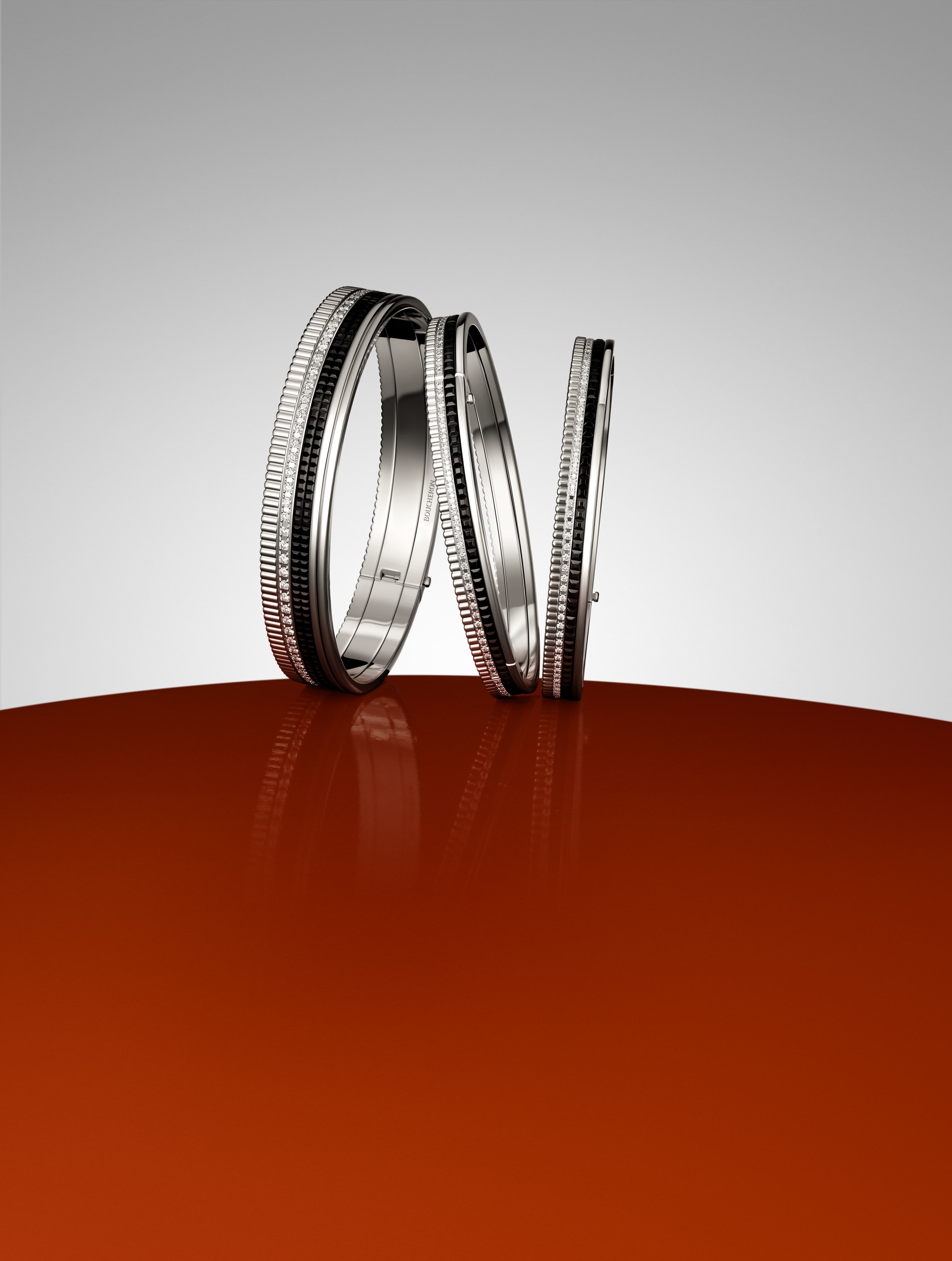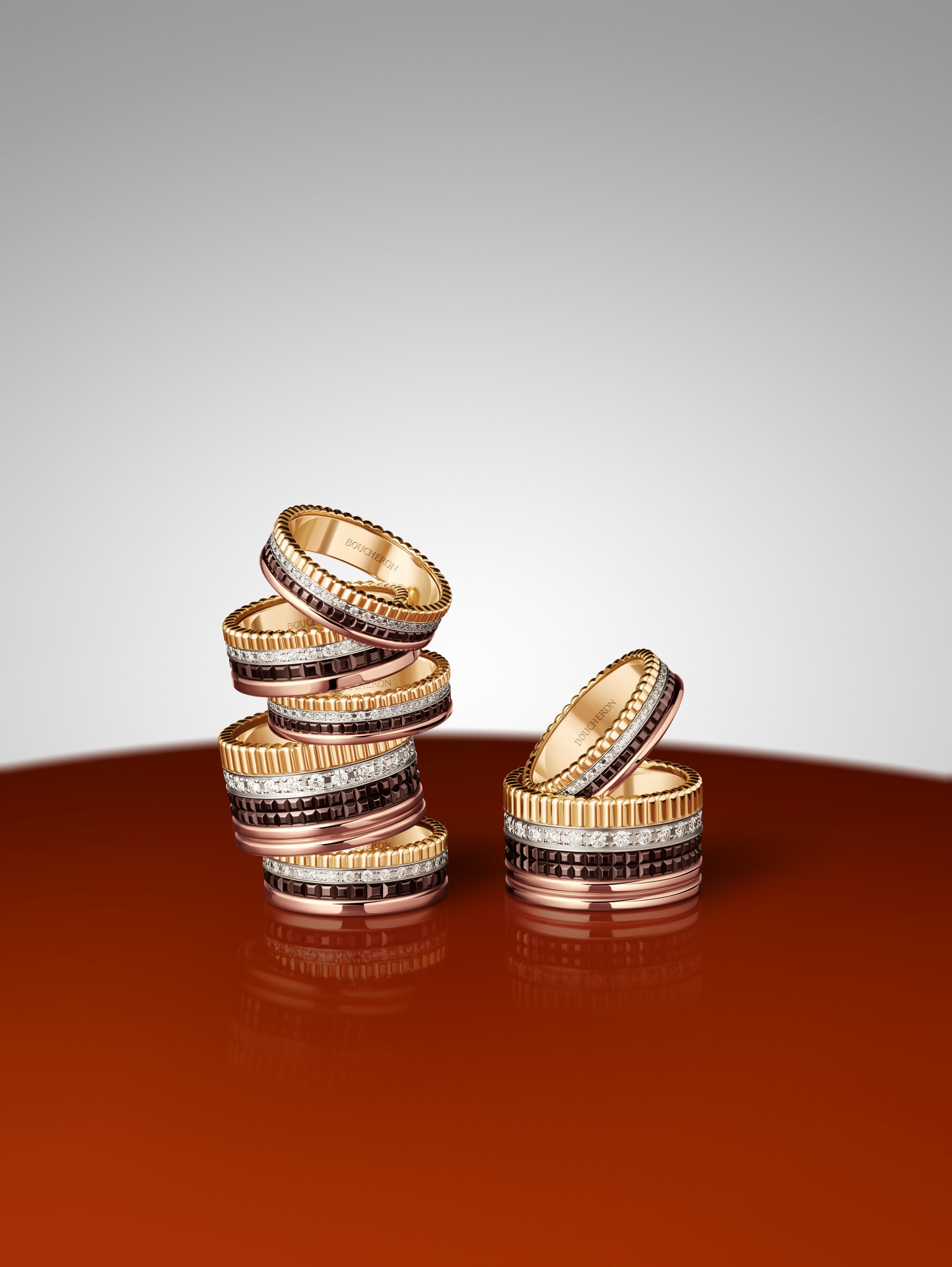 自19世纪60年代起便深受青睐的罗缎直线刻纹,凝聚着世家传承与家庭纽带所赋予的坚定自信。其灵感源自高级定制时装中的罗缎丝带,致敬了创始人菲德烈克·宝诗龙(Frédéric Boucheron)先生出身布匹商家庭的高定时装背景。对于佩戴者而言,该饰纹时刻提醒着:自信不仅是单纯的个人特质,亦是由至亲之人的爱与支持滋养而成的珍贵馈赠。