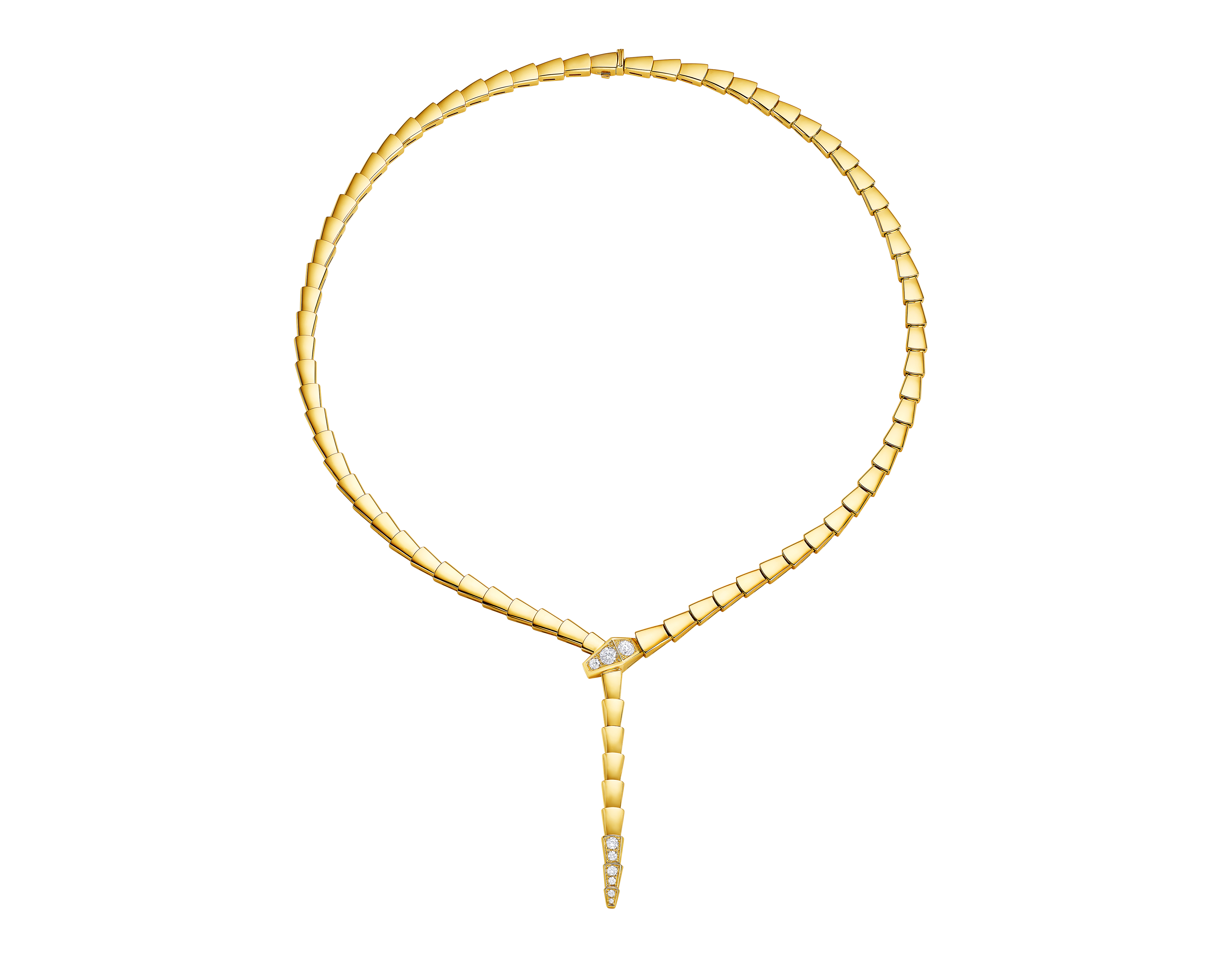 与品牌传承紧密相连的珍贵18K黄金材质,为Serpenti Viper系列新作注入温润光泽与当代风采。一款项链以精巧的灵蛇吊坠优雅盘绕于链身之上,细腻呈现灵蛇的曼妙曲线。另一款更具现代风格的项链,则以迷人的几何造型与蜿蜒有致的线条,勾勒出灵蛇柔美缱绻的身姿。蛇首与蛇尾处点缀着密镶钻石,于光影流转间折射细腻辉彩。与之相映成趣,一款18K黄金垂坠耳环展现出同样的律动美感,密镶钻石的蛇首与蛇尾于佩戴者的步履间闪烁耀眼光芒。
