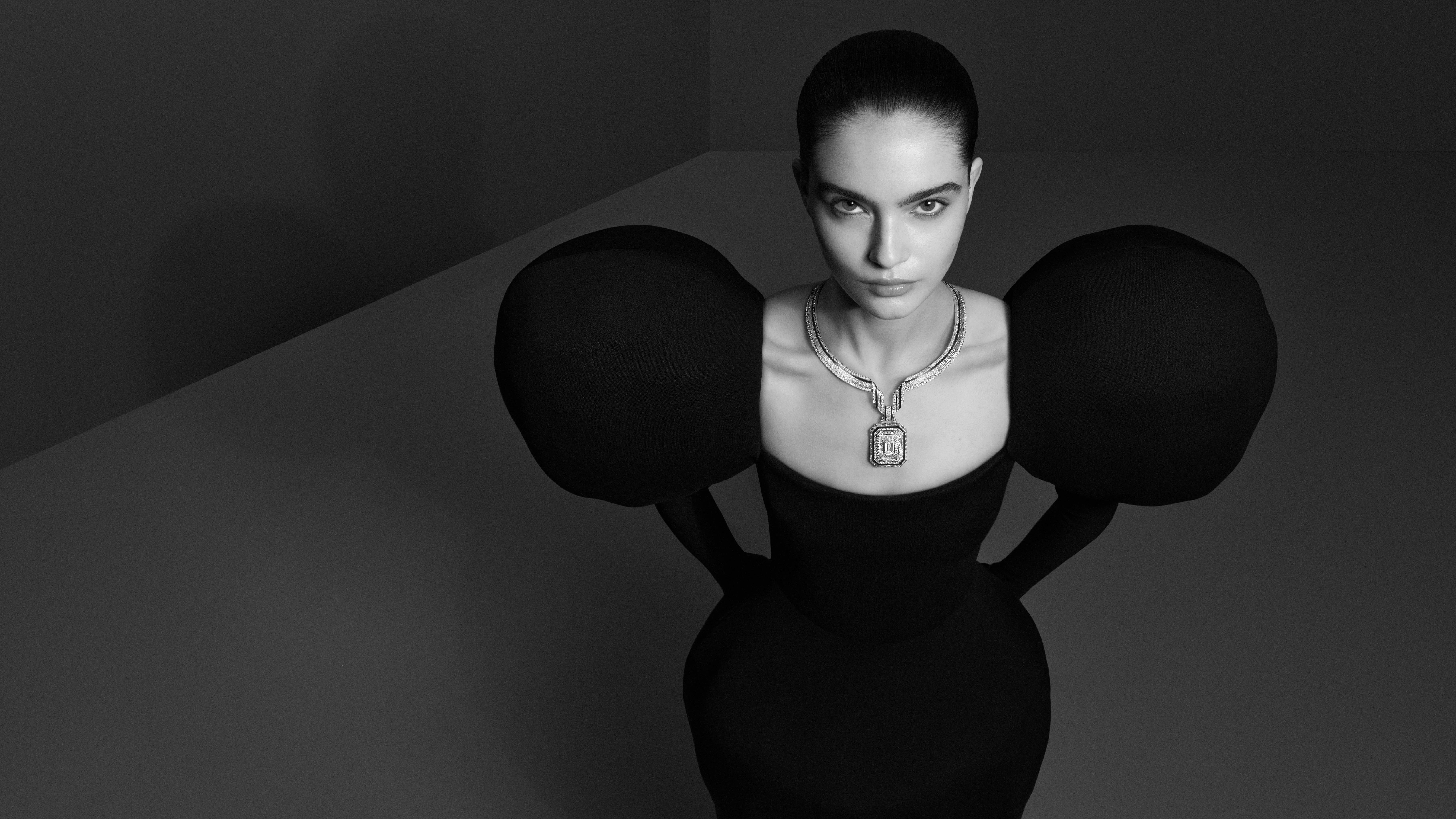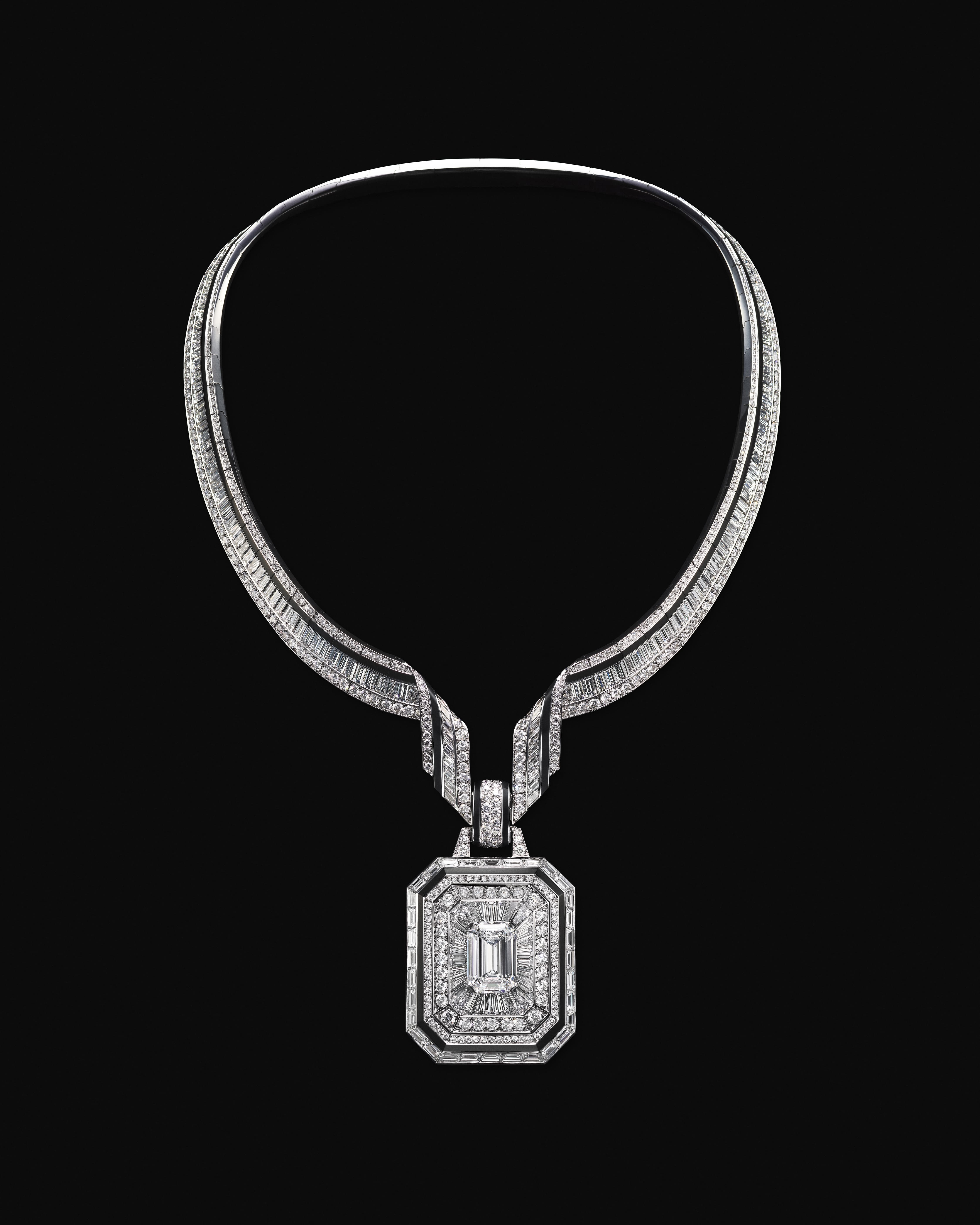 Claire Choisne重新诠释了一件源自世家典藏档案的项链,其吊坠的造型令人联想到八边形的芳登广场,以此向宝诗龙史诗般的传奇历程致敬。她以更为利落的线条重塑经典,并巧妙运用白金与钻石的纯粹单色质感,与深邃黑漆形成鲜明的视觉对比。作品的焦点来自由祖母绿形切割图案构成的“镜中镜”(mise en abyme)视觉效果,中心镶嵌一颗重达10.01克拉的璀璨钻石,成为整件作品的点睛之笔。独具建筑感的层叠结构,确保每一颗长阶梯形、圆形或祖母绿形切割钻石皆能以理想角度捕捉光线。对工匠而言,这件作品最大的技术挑战在于,如何在硬朗的几何结构中演绎出流畅感。饰有黑漆镶边的颈圈部分虽由诸多铰接结构精妙构成,却呈现出浑然一体的视觉效果,优雅环绕于颈间。长阶梯形切割钻石亦经过重新切割与精准定向,完美贴合颈圈的自然弧度。此外,这件作品还蕴藏一处巧思——中央吊坠可拆卸作为一枚戒指单独佩戴。