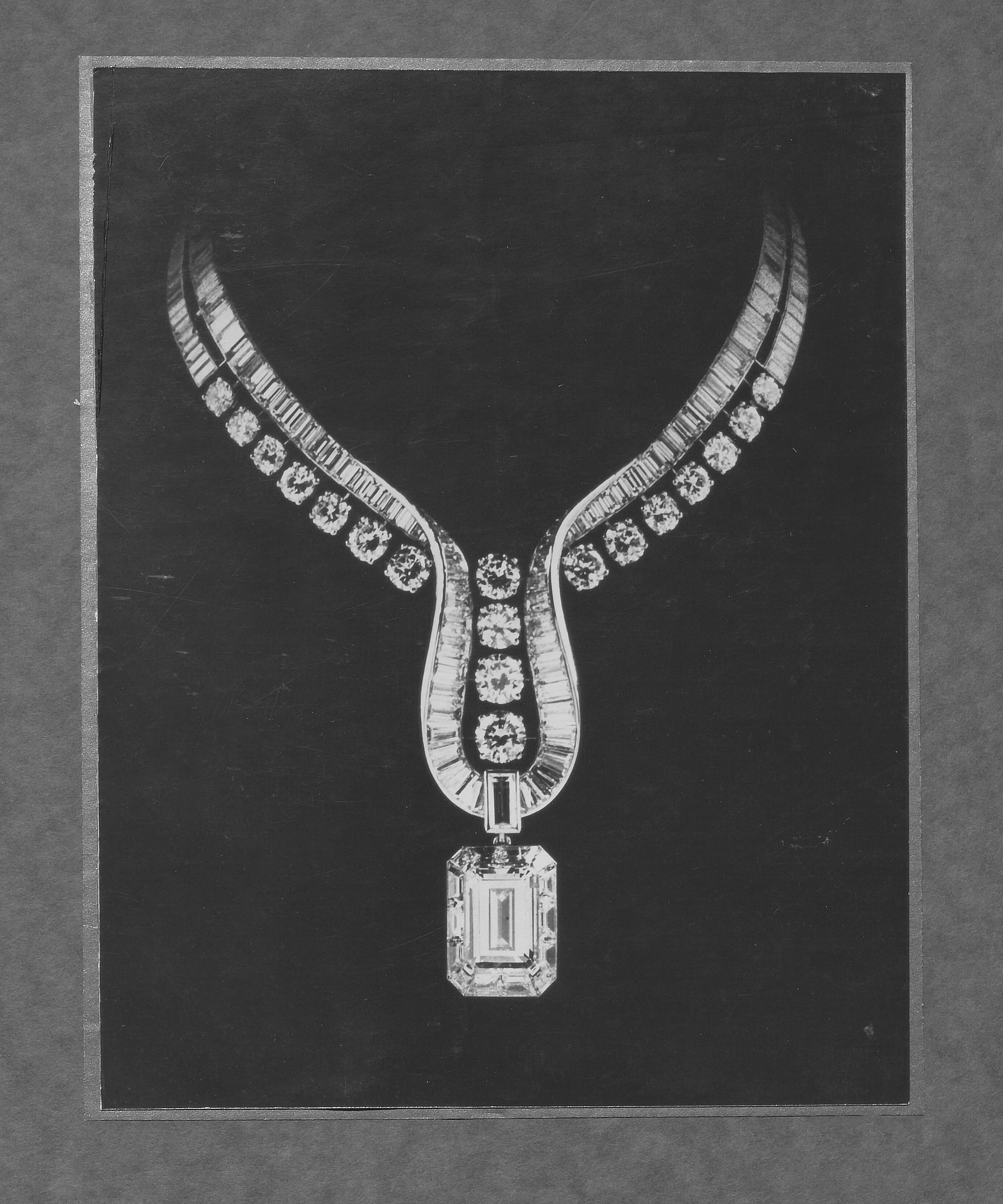 采用白金材质,镶嵌一颗重10.01克拉的祖母绿形切割钻石(D FL IIa),铺镶钻石,饰以黑漆。
