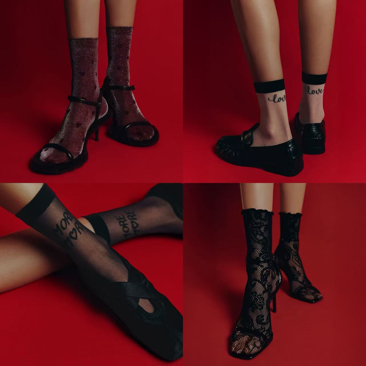 本系列亦推出多款设计感短袜,以精巧细节装点节日氛围感穿搭。爱心细闪短袜泛有细腻珠光,灵动爱心图案隐现其间,并搭配卷边袜口修饰踝部线条。字母拼色短袜以经典黑白色块碰撞拼接,构建出简约利落的视觉层次。黑色字母短袜宛如藏于节日下的朦胧暗语,在步履间悄然传递心动信号。网眼花纹短袜将经典织法与雅致蕾丝花纹相结合,诠释意式优雅生活美学。