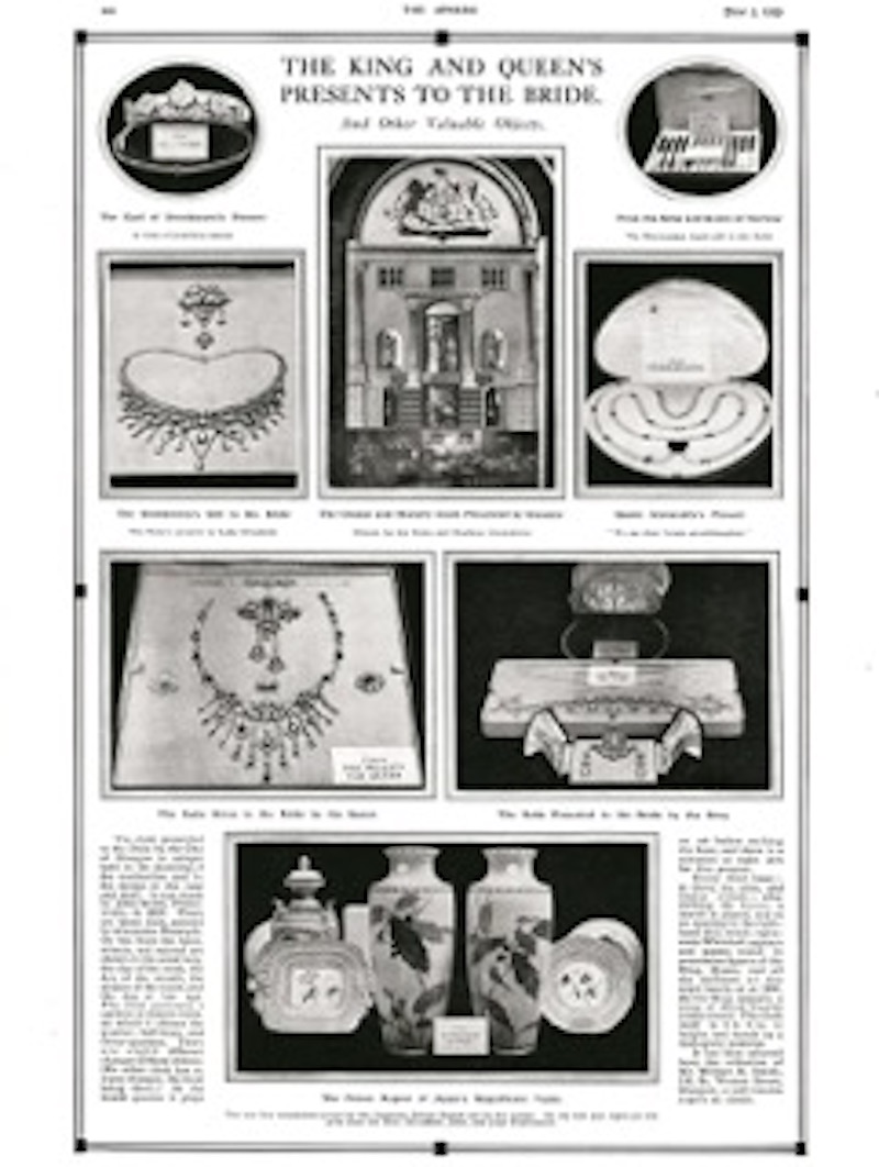 1923年4月,阿尔伯特王子(Prince Albert)与伊丽莎白·鲍斯-莱昂女士(Elizabeth Bowes-Lyon)大婚;“国王与王后赠予新娘的礼物”广告,展示了为这场皇室婚礼准备的钻石珠宝与贵重礼品