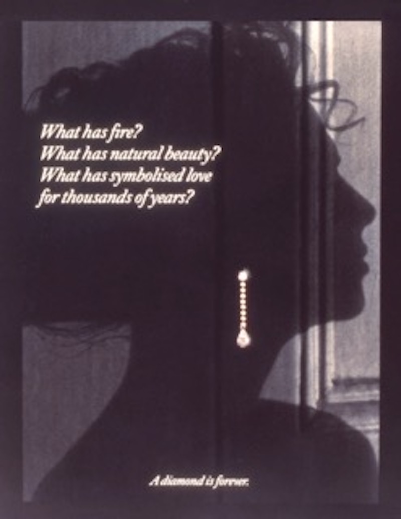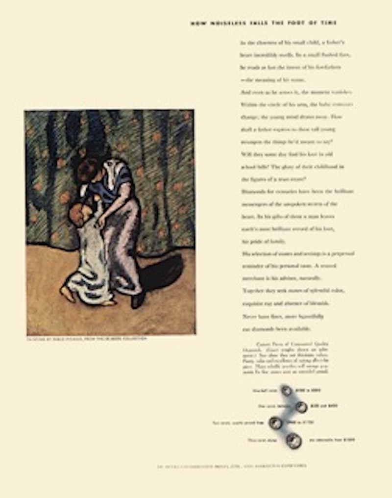 1940年左右,戴比尔斯广告刊载由巴勃罗·毕加索(Pablo Picasso)受委托创作的画作《How noiseless falls the foot of time》
