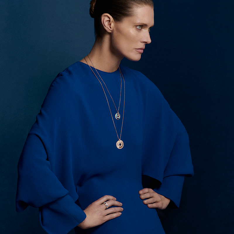 此次,Possession时来运转鎏金焕彩系列新作开启了全新维度的美学探索。作品首次演绎硬质宝石马赛克微镶工艺,将宫廷式图腾装饰(Decor Palace)这一标志性的金工技艺与天然装饰宝石的瑰丽华彩和谐相融。温润的玫瑰金材质表面饰以精心抛光的圆模雕刻装饰,在半月形钻石和彩色宝石的映衬下,凸显出不对称构造的轻盈灵动。每一颗宝石皆独一无二,秉承PIAGET伯爵悠久工艺传承悉心雕琢而成,缔造出精妙非凡的珠宝艺术臻作。宝石的天然纹理、方形与椭圆形线条的巧妙交替、微妙的色彩层次以及光影流转,交织出一幅充满动态张力和对比美感的微型画作。莹润的绿松石、湛蓝的方钠石和深邃的蓝线石,经悉心切割拼嵌成迷人的马赛克图案,将每一件作品升华为时刻守护佩戴者的珍贵护身符。圆形象征着繁荣与好运,宝石凝萃着平安的期许。PIAGET伯爵以现代设计巧妙致意这份跨越文化的共鸣,将这份深邃寓意融入Possession时来运转系列的美学之中,为闪耀珠宝增添更为动人的情感温度。