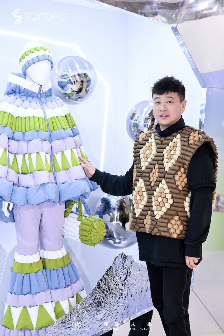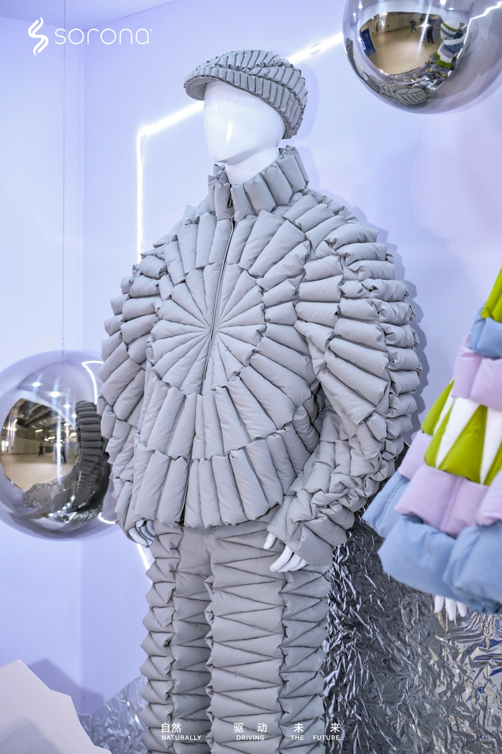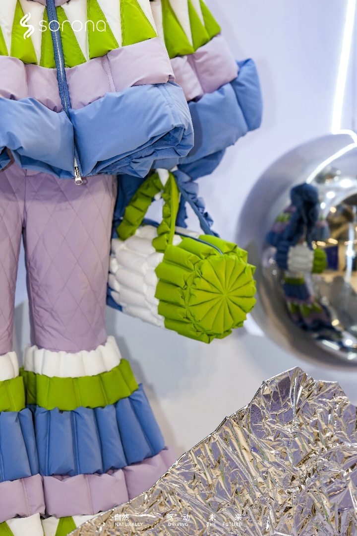 当柔韧绵感、自然弹性、轻松易打理的含SORONA®生物基材料的外层面料,与保暖、轻盈、蓬松的SORONA®Aura填充材料,在RAXXY品牌创始人沈威廉的巧思妙手下,化作马赛克结构的装饰画、模特身上的裤子、外套以及包包、帽子,其中所折射出的,不仅是SORONA®品牌对时尚创意的看中,更是材料方对积极参与未来服装结构构建的深思熟虑与前瞻预判。